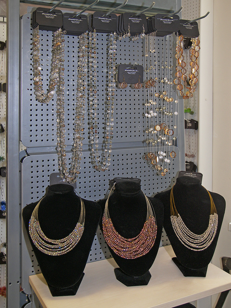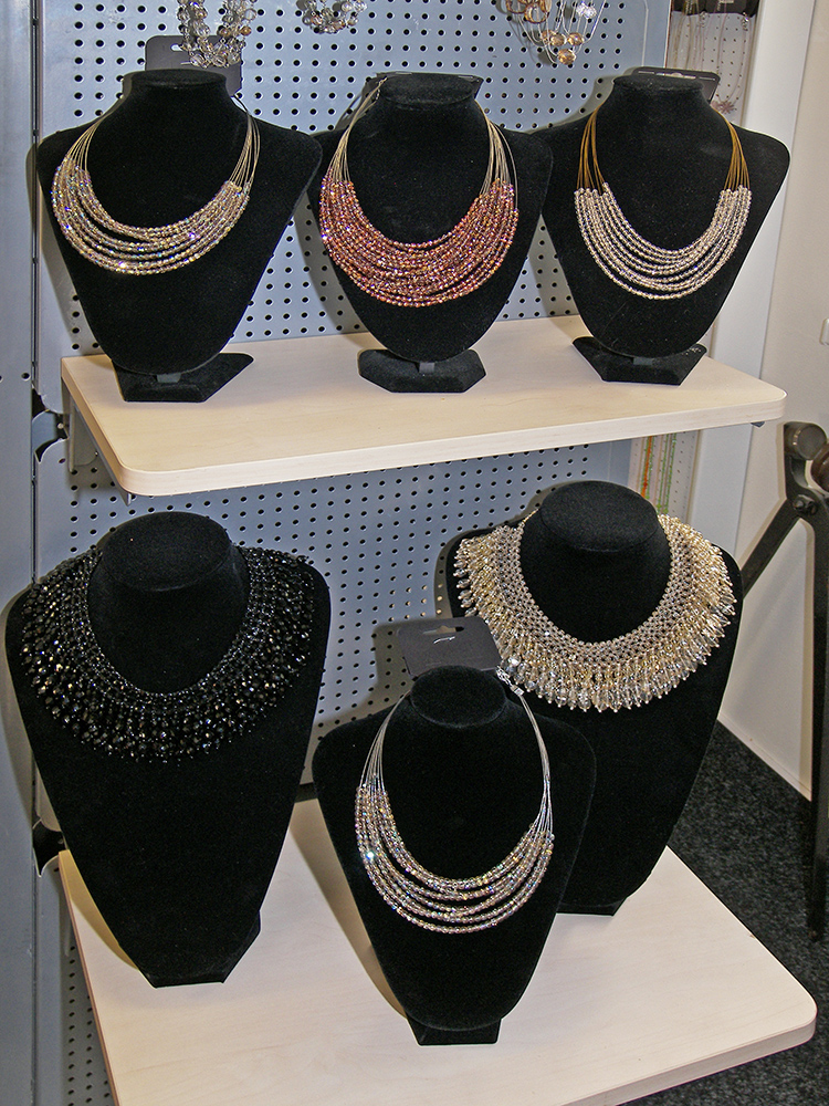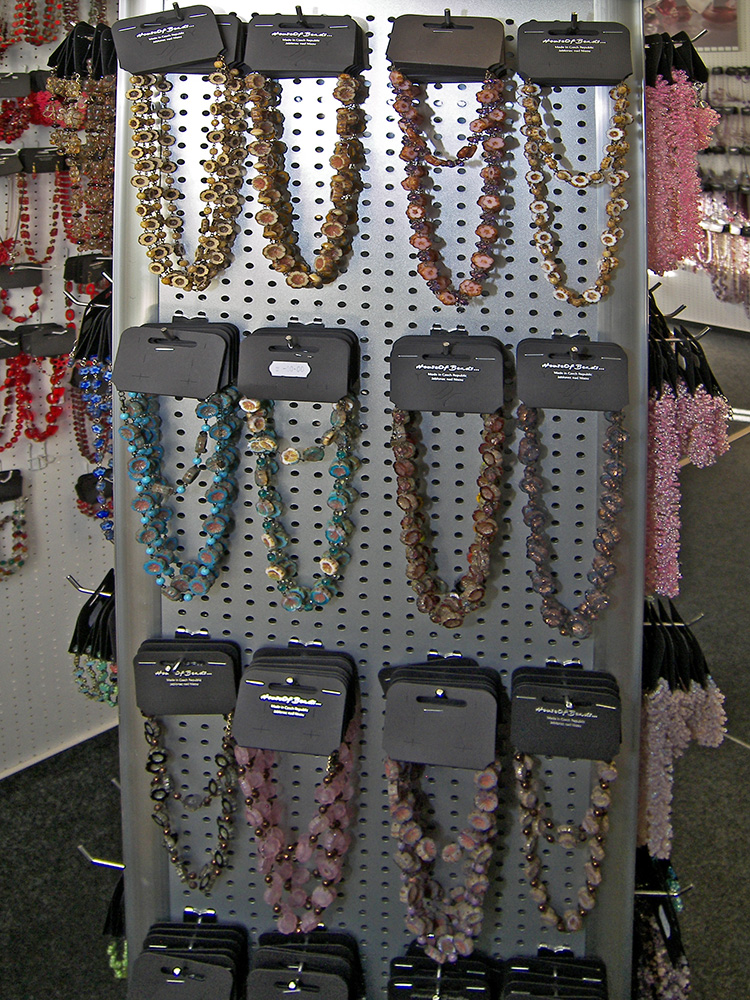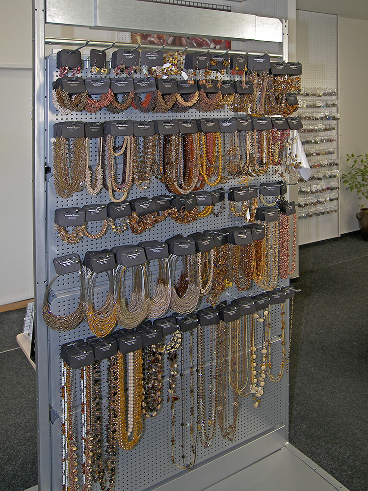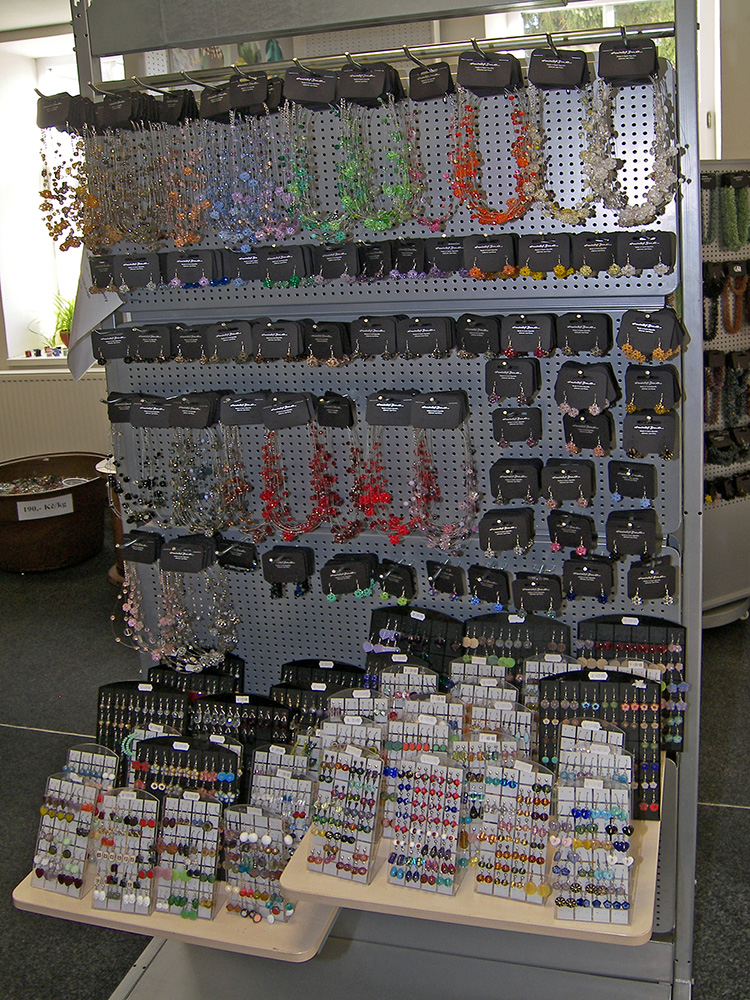 Sortiment: bižuterie skleněná, bižuterie kovová, bižuterie z jiných materiálů, skleněné kameny, mačkané perle a ohňovky, skleněné perle vinuté, perličky (rokajl, šmelc), perle ostatní (dřevo, plast, přírodní), bižuterní polotovary a komponenty, skleněné knoflíky, skleněné vánoční ozdoby, skleněné reklamní předměty a suvenýry, obaly na sklo a bižuterii.